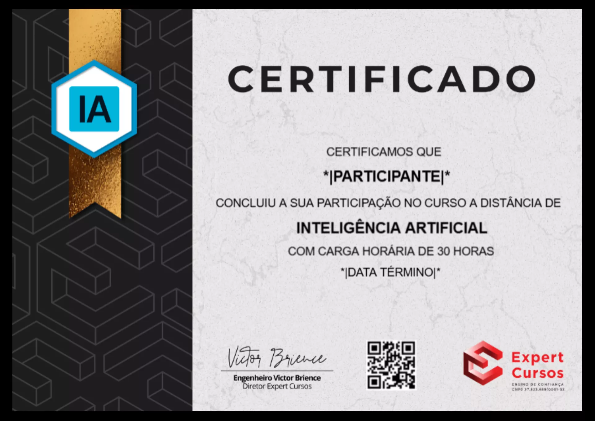 Você vai aprender tudo sobre Inteligência Artificial, com Certificado Reconhecido como capacitação profissional com carga horária de 30 horas, uma Área de Membros exclusiva onde você pode tirar todas as suas dúvidas com nossos professores.